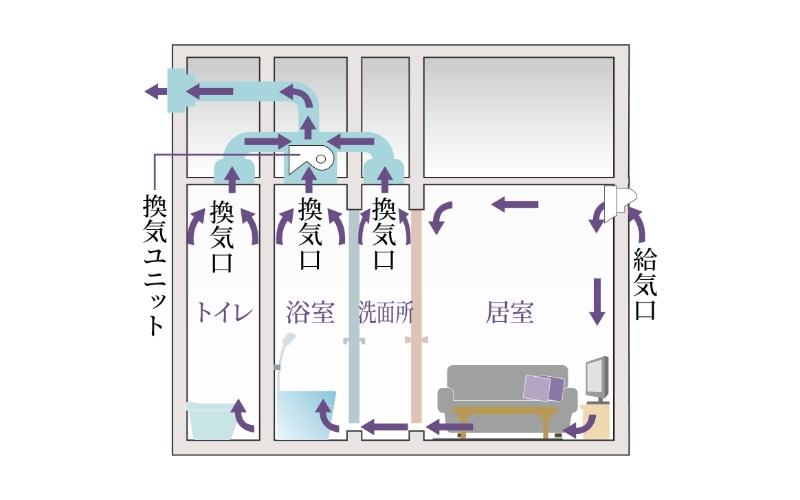 住まい全体に自然な空気の流れをつくるとともに、湿気がこもりやすい所も、スムーズな空気循環を行うことができます。