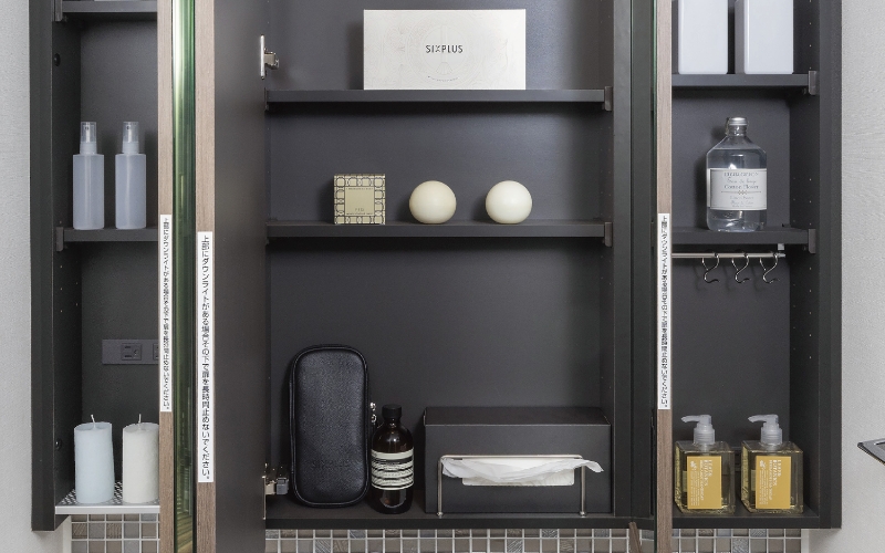 大型ミラーの裏側に化粧品などのほか、ティッシュボックススペースやコンセントも備えた収納棚を設置。