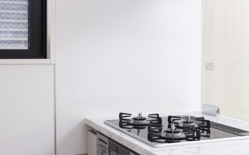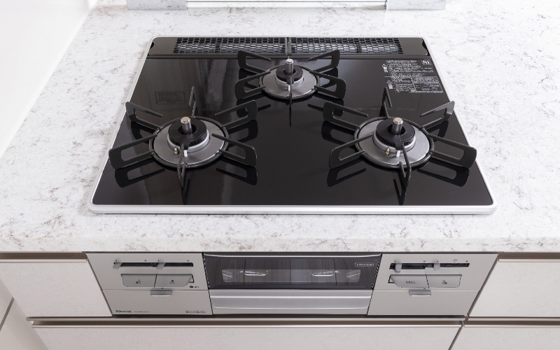 調理の効率を上げる3口タイプのコンロ。ガラストップで吹きこぼれ等の汚れも簡単にお掃除できます。