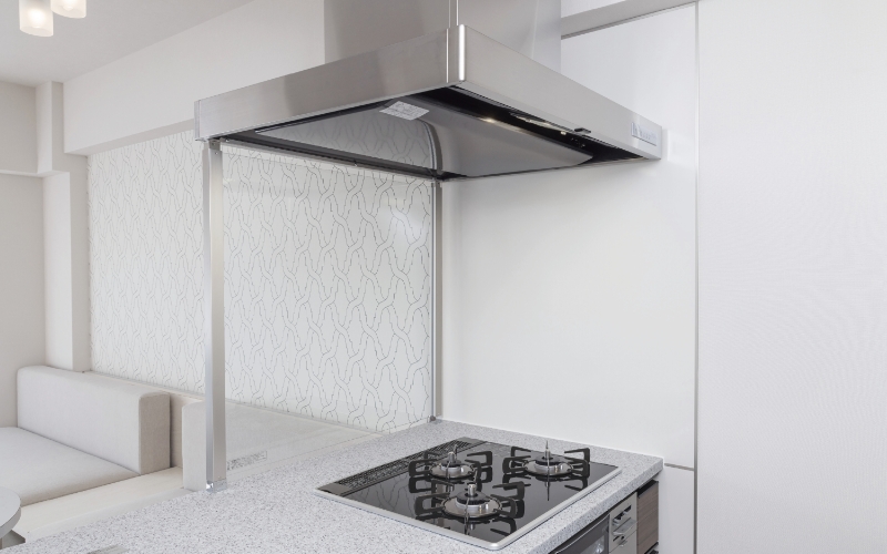 調理中の油ハネをガードできてサッと拭き取れるお手入れのしやすさ。リビング・ダイニングも見渡しやすく開放的です。