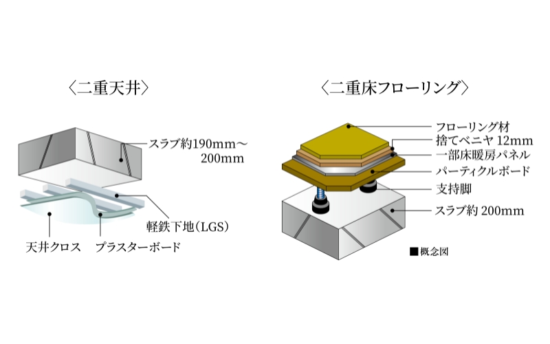 将来のメンテナンスやリフォームにも柔軟に対応する二重床・二重天井。床はゴム付支持脚の採用により遮音性にも配慮しています。