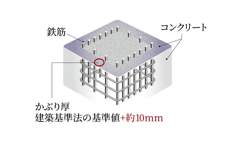 鉄筋に対するコンクリートの設計かぶり厚さを建築基準法の基準値に約10mmプラスし、耐久性に配慮しています。