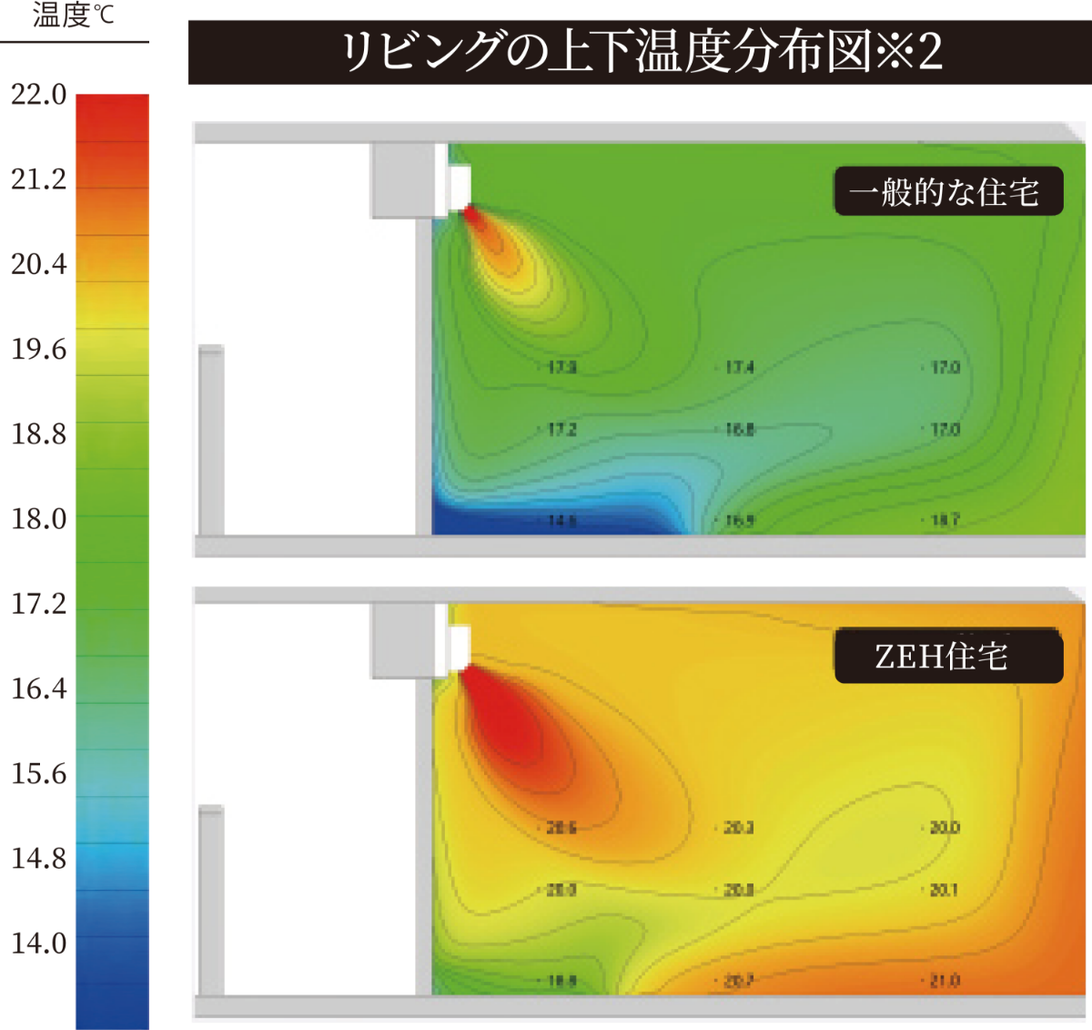 ※『一般的な住宅』と『ZEH住宅』についてCFD解析にて、LDの室内温度分布シミュレーションを実施:解析条件〈シミュレーション共通条件〉・外気温度:−0.5℃(拡張アメダス気象データ2010年版標準年より東京の最低気温)・平面プランは省エネ基準策定モデル(RC、70㎡)を参照・妻側中層階住戸を想定・エアコン設定:24℃吹出、循環風量8㎥/min・換気設定:24時間換気0.5回/h『一般的な住宅』・品確法「断熱等性能等級3程度の外皮性能を想定」外皮熱貫流率/外壁:1.11[W/㎡・K]窓:6.51[W/㎡・K]『ZEH住宅』・ZEH-M「Oriented程度の外皮性能を想定」※参照元:「集合住宅におけるZEHの設計ガイドライン」(集合住宅におけるZEHロードマップフォローアップ委員会)外皮熱貫流率「外壁:0.393[W/㎡・K]」「窓:2.15[W/㎡・K]」※日射・人体発熱・家電製品の発熱は考慮しない※他室・他住戸との熱の移動は考慮しない。